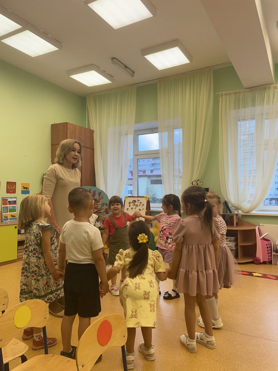 Мы регулярно проводим занятия на свежем воздухе, где дети бегают, прыгают и играют в подвижные игры. Это не только укрепляет их физическое здоровье, но и развивает командный дух и социальные навыки. Через ежедневные физические активности я стремлюсь формировать у детей привычку к движению, что важно для их будущего.